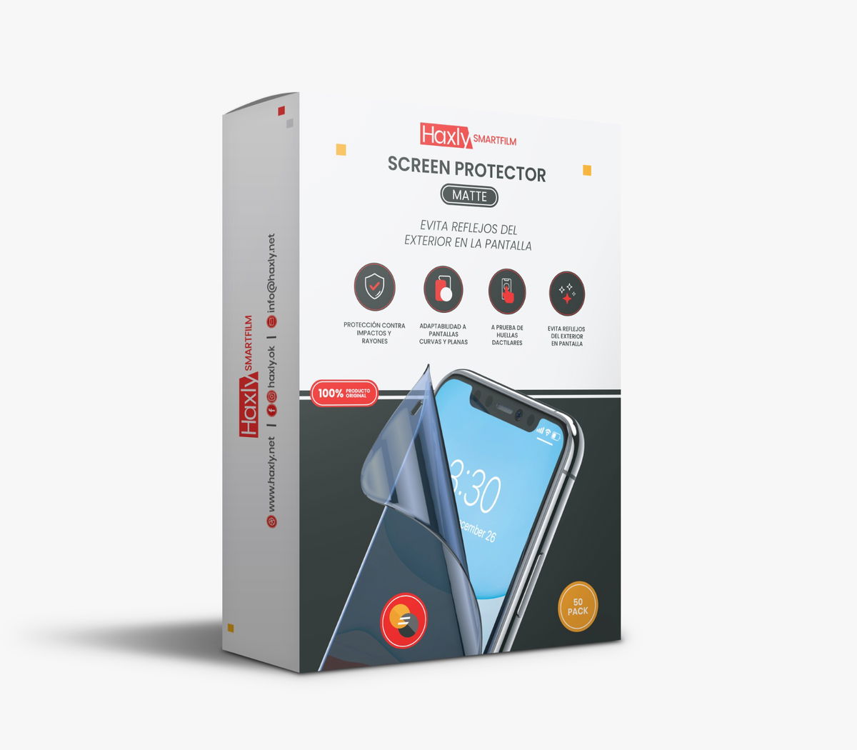 Evita reflejos del exterior en la pantalla y protege de impactos y rayones. Además, cuenta con un sistema a prueba de huellas dactilares y se adapta perfectamente a pantallas curvas y planas.